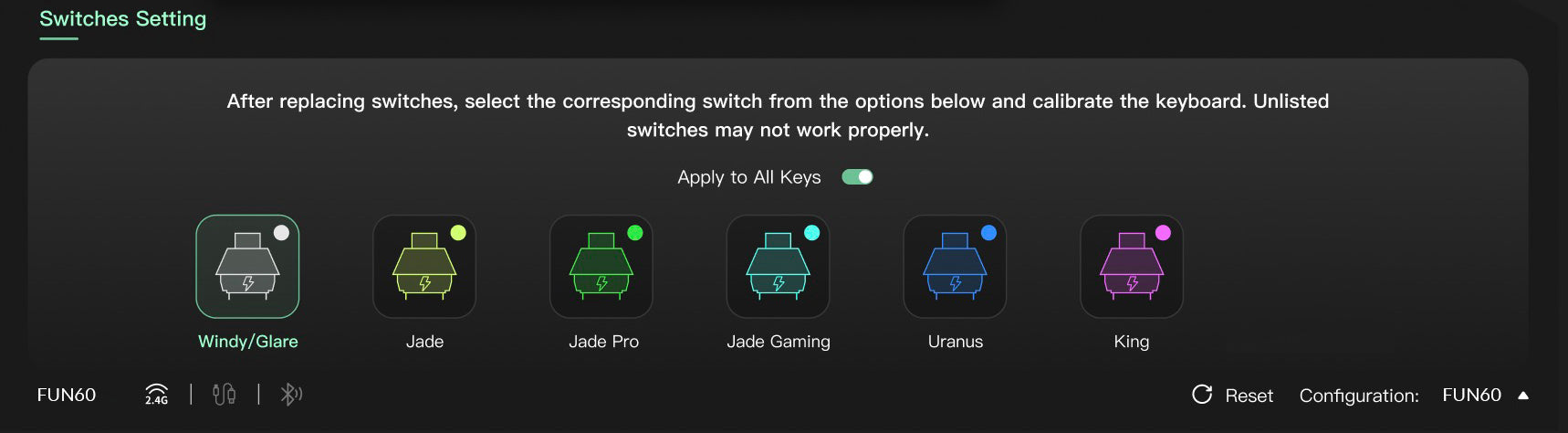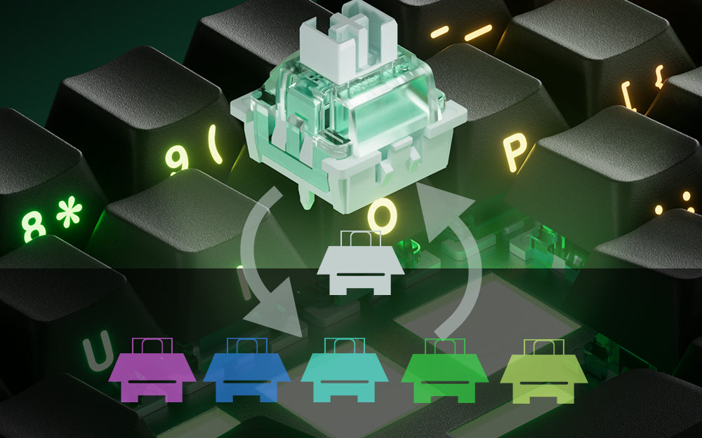 The FUN60 Series (except FUN60 Basic Version)offers cross-compatibility with 5 third-party magnetic switches. Users can select the corresponding switch from the list in the MonsGeek Driver and easily calibrate the keyboard after replacement. You can also mix and match them in different keys simultaneously.