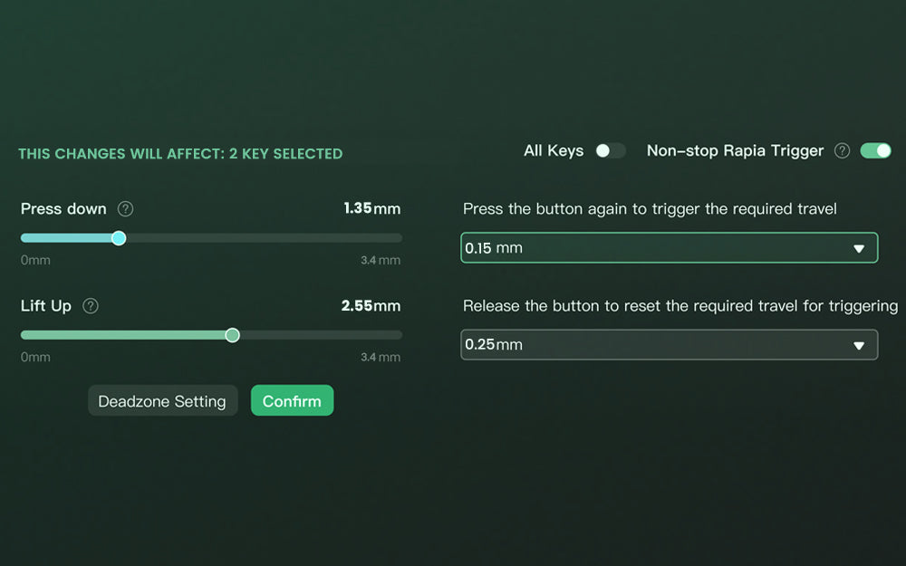 Adjustable Actuation Distance These magnetic switches allow users to adjust every key’s actuation point from 0.1mm to 3.4mm, which offers different kinds of pressing for gaming or typing. |