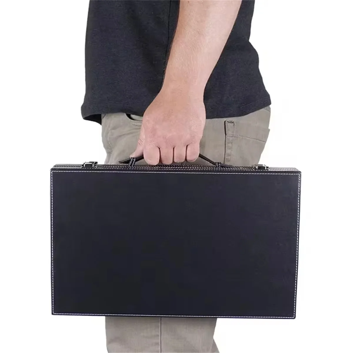 This backgamon set is made of PU leather, exquisite sewing leveling and excellence craftwork. Suitable for chess and entertainment, venue amusement equipment. This is a good recreational game, suitable for relaxation. Nice gifts for advertising, business, awards, conference, etc. This classic backgammon game is the perfect set for beginners and advanced players alike and includes everything you need to play. The backgammon board game comes with a premium felt playing field with leatherette pips and organizational sections for checkers and accessories. The game set storage box can fold in half with all accessories inside, for a truly easy to store and carry set; Kept secure by metal clasps. Item type: Backgammon Set Checkerboard Box Size: approx. 38x23x5cm Colour:As Shown Material:PU Package Contents: 1 x Strategy Backgammon Game Set Only the above package content, other products are not included. Note: Light reflection and different displays may cause the color of the item in the picture a little different from the real thing. The measurement allowed error is +/- 1-3cm.