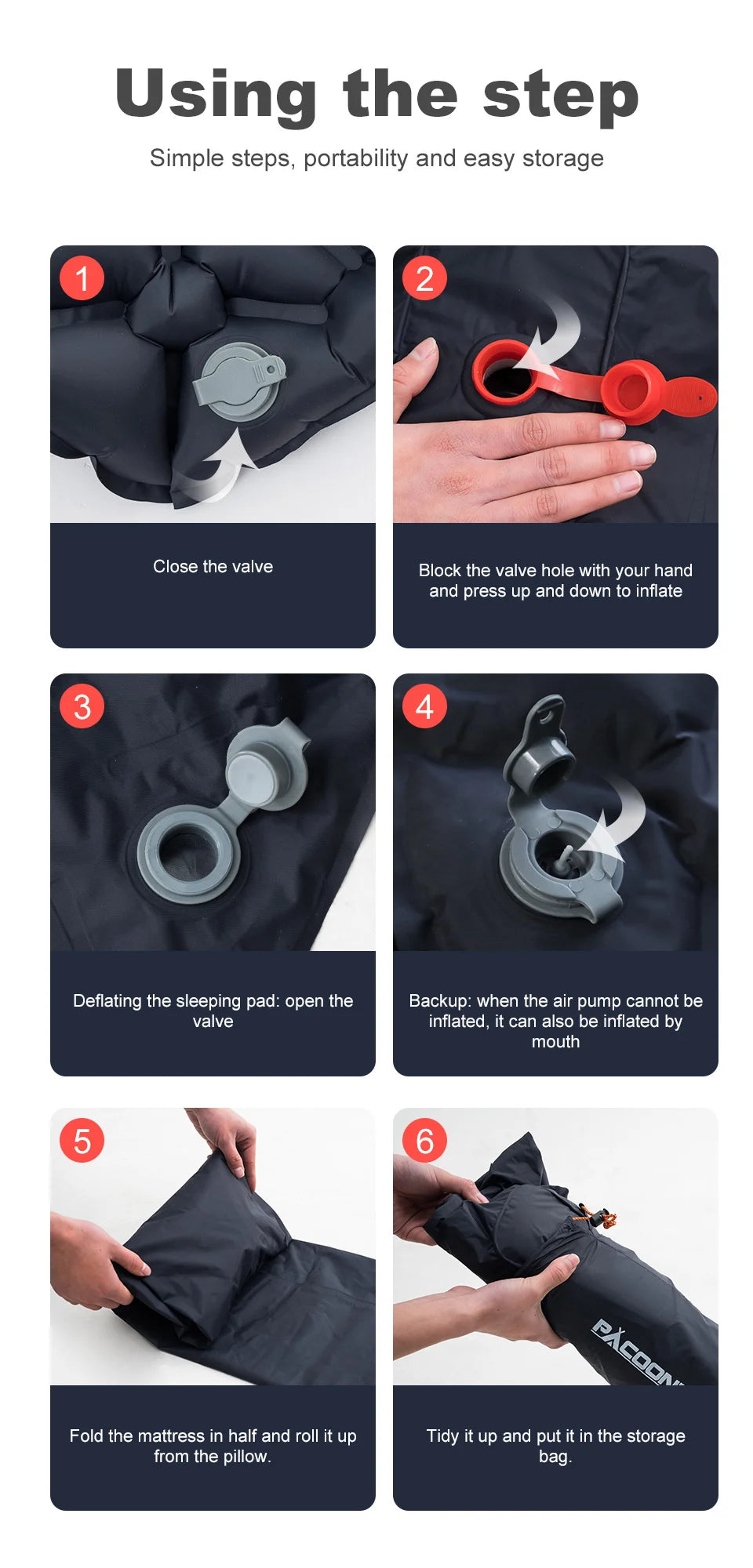 3.The sleeping pad folds down to about 27*10*10cm and weighs only about 600g. With a built-in air pump and pillow, no need to carry extra pillow. Once deflated and folded, the camping pad fits easily in your pack, and it's super lightweight and space-saving, leaving plenty of room for other equipment